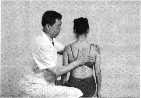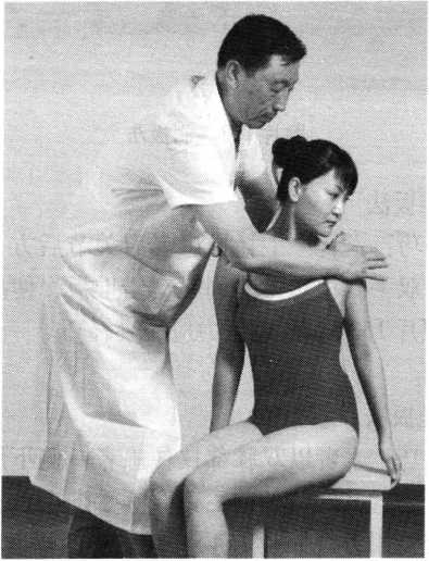 坐扳法操作技巧:术者以双膝部挟住患者一侧下肢以固定体 位,双手分别置其两肩的前后部,一手向前内,一手朝后 外,同时交错用力(照片154)。注意推的幅度不宜超出生 理功能活动范围。一侧完毕,同法操作对侧。