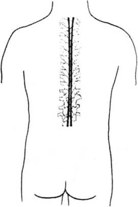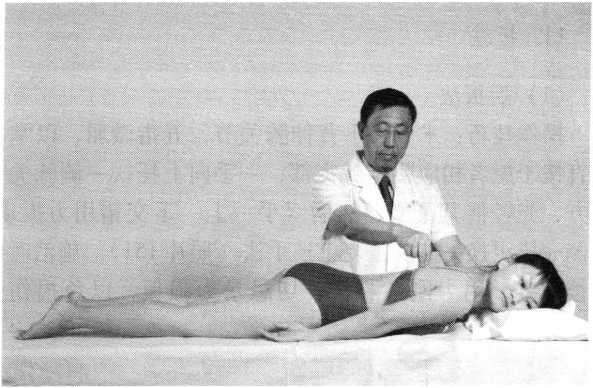 激法操作技巧:术者用拇指槎侧偏峰着力于患者棘突旁, 垂直棘突施力,作自上而下疾速有力的推压,反复3~5 次,用力均匀适度(定位图19,照片162)。一侧完毕, 同法操作对侧。此法为强刺激手法之一,施治时应以病人 能忍耐为度。