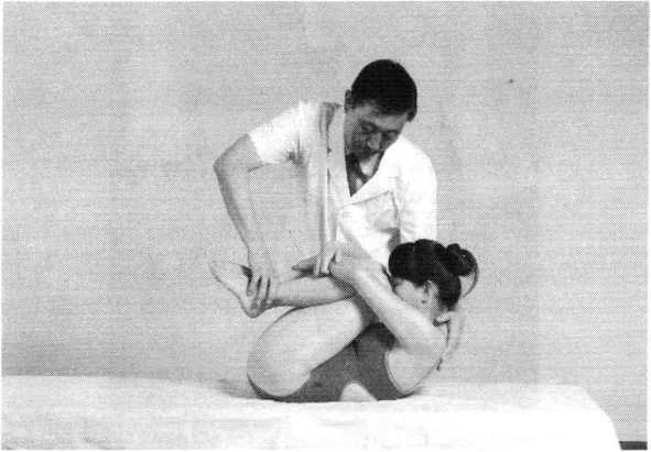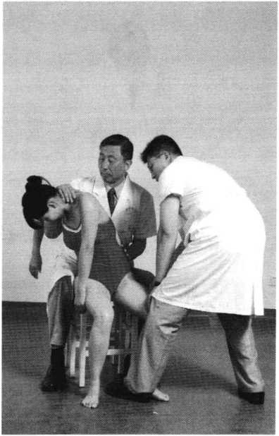 操作技巧:助手面对病人而立,双手按压其膝关节上 方以固定体位。术者一手从其腋下绕过肩前按于颈后,使 头部略前屈,另一手扶托于患者腰部,并以其为支点,缓 慢轻柔地旋转腰部,幅度从小到大,循序渐进,使腰部肌 肉得到最大幅度的伸展。频率宜慢,用力均衡持续,勿超 出生理功能范围(照片155)。