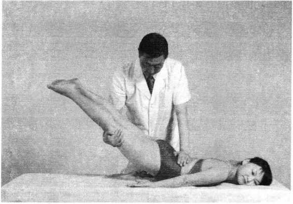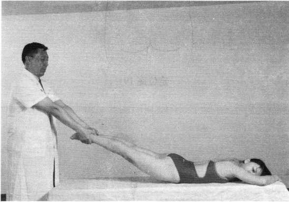 操作技巧:患者俯卧,两手固定扶握于床头。术者两 足分开与肩同宽,双手分别握住其两踝,向远心端用力牵 拉,同时上下或左右抖动双下肢。操作时亦可由助手行对 抗牵引之力(照片163)。注意施用此法时,用力要轻柔和 缓,平稳连贯,应在患者腰部充分放松状态下进行。