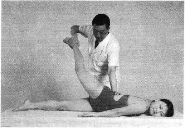 牵按法操作技巧:术者一手腕关节背伸,手掌向下按压患者 腰部,一手握住踝关节向后上方牵拔。用力要轻柔协调, 持续适度,牵按幅度由小到大。一侧完毕,同法牵按对侧 (照片157) o