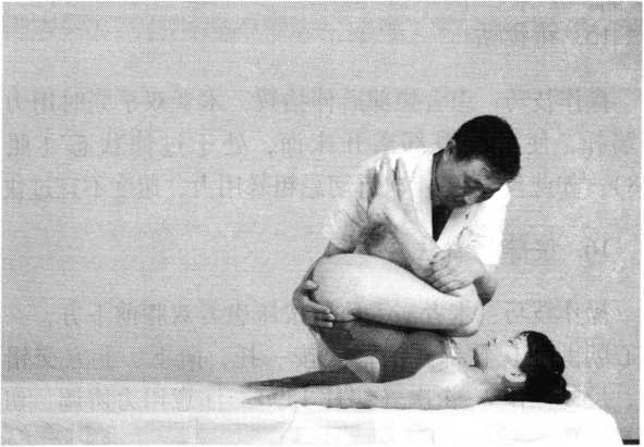 后扳法操作技巧:术者一手背伸腕关节,五指微屈,以掌根 垂直按于患者相应腰椎棘突部,一手向上托扶一侧膝关节 前方,先轻摇其下肢,然后双手一上一下交错用力扳动, 一侧完毕更换另侧,重复上述手法(照片151)。施治时应 谨慎稳妥,用力刚柔相济,切忌暴力强扳,以免损伤关。