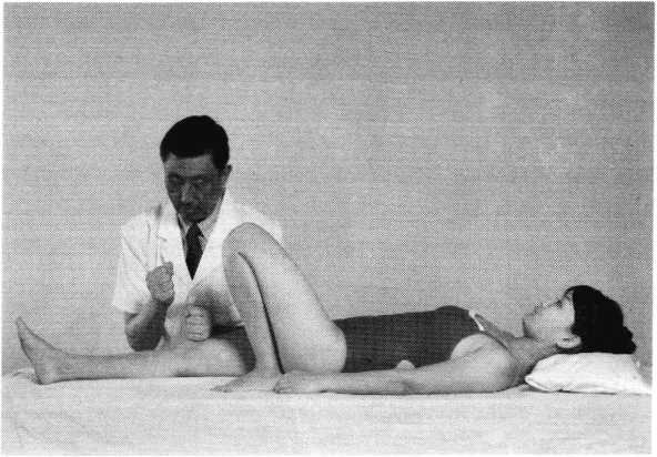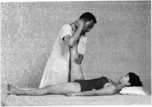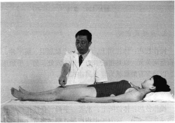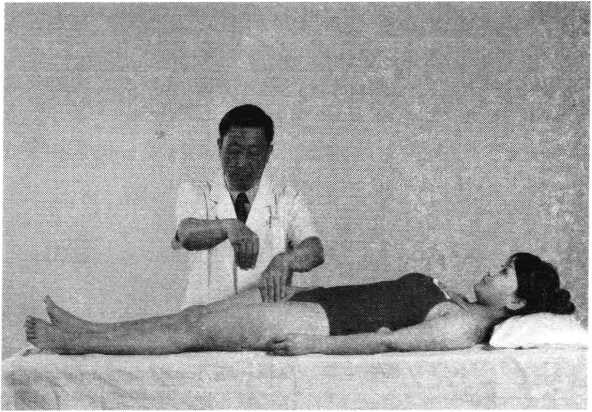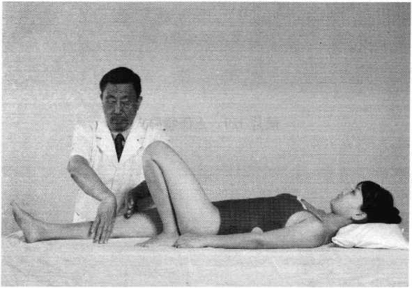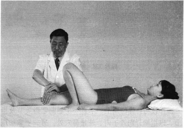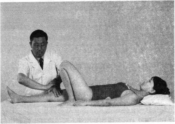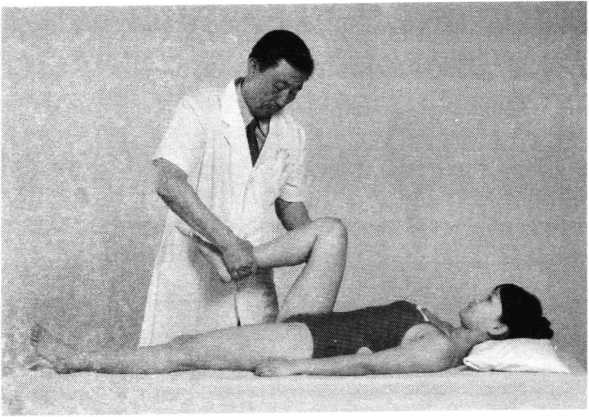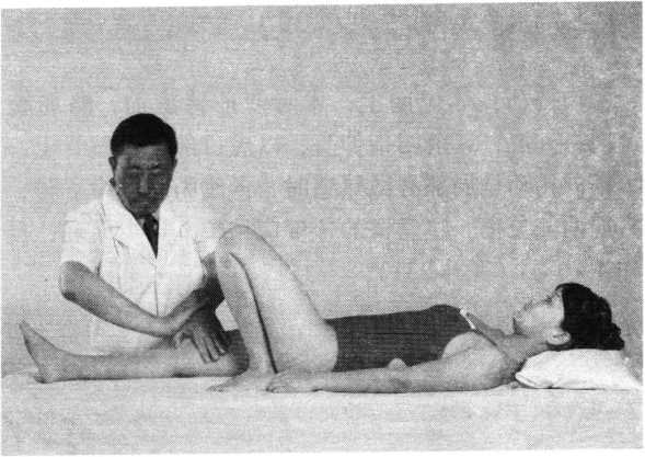 屈伸法操作技巧:患者仰卧位,术者立于一侧,一手扶托胴 窝处,另一手握踝关节,双手协同,反复做屈髓屈膝动 作。注意用力应适度,一般操作3〜6次即可(照片333)。