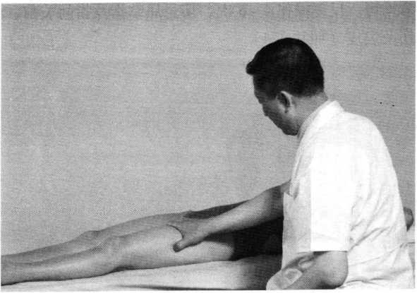 筋法操作技巧:体位同上,术者一手扶按大腿以固定体 位,另一手略屈腕,拇指与其余四指屈掌指和指间关节, 并呈对钳状,分别捏压于族骨的内、外缘,施由近而远的 捏移滑动之力,以患者局部有酸痛感为宜。用力和缓适