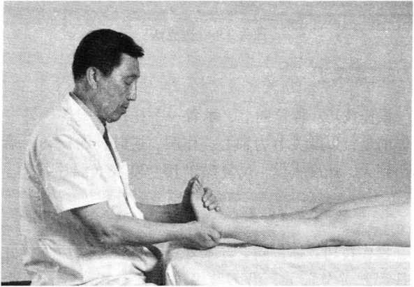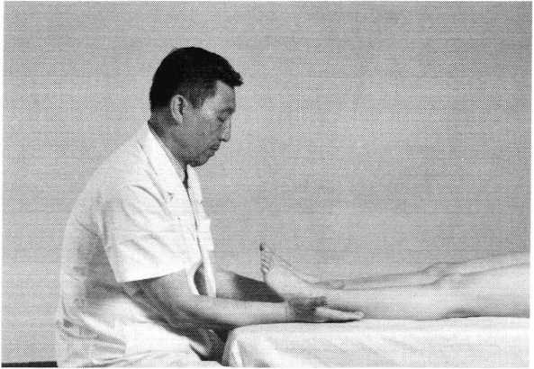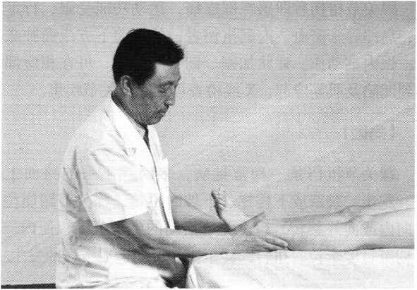展筋法操作技巧:体位同上,术者一手掌扶按歌骨上方,另 一手握前足,极度背伸踝关节,使患者小腿后方肌群有紧 张酸胀痛感为宜。反复操作2 ~4次即可(照片334)。