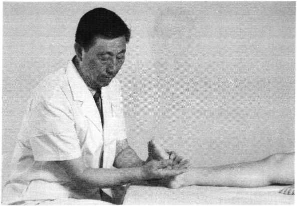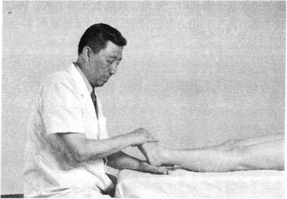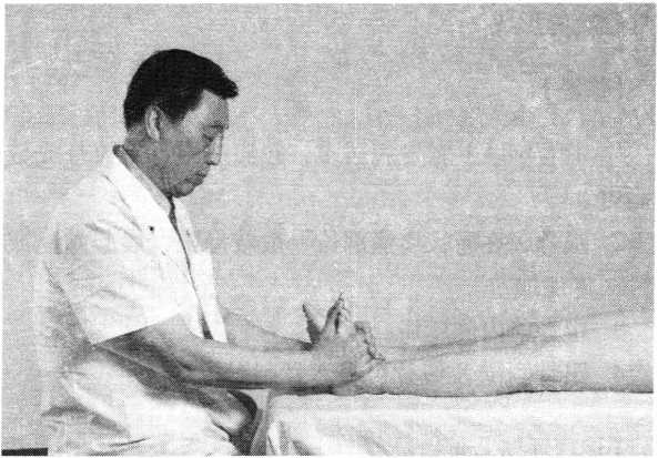 点血海穴操作技巧:体位同上,术者一手拇、食指指端夹住中 指远端指间关节,运力于中指指端点颤血海穴,另一手掌 加压,以局部有酸胀感为宜(照片326)。