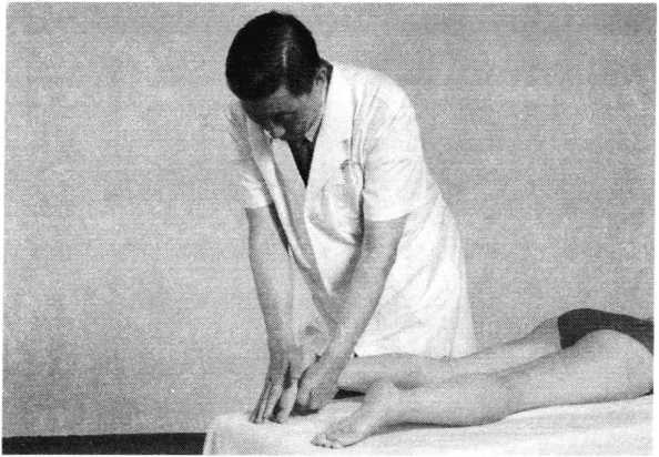 顶挑法操作技巧:体位同上,术者一手扶按足跟后方,另一 手握实拳,掌心向上,以第三掌骨头部顶挑跟骨前内侧痛 点。用力由轻渐重,以患者有强痛感为宜,反复顶挑4〜6 次即可(照片343)