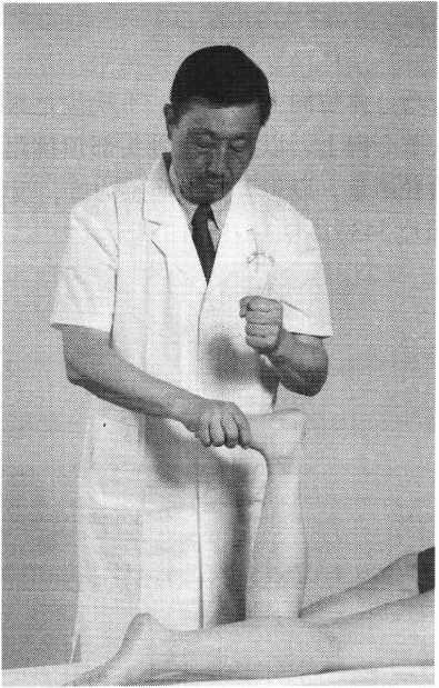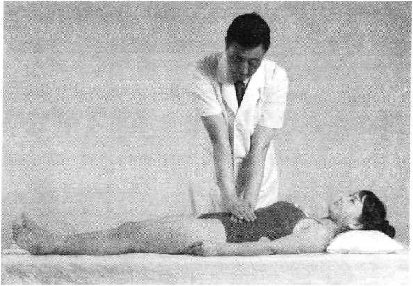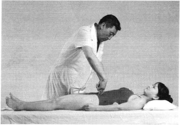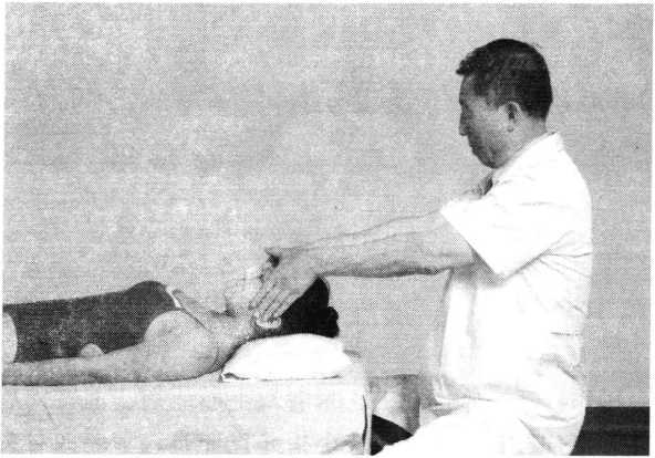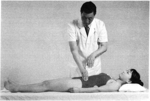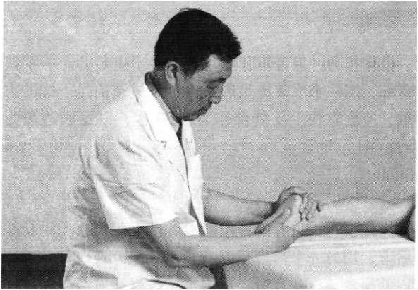 点关元穴及足三里穴操作技巧:患者仰卧位,术者坐于一侧,一手中指屈 掌指关节,伸指间关节,食指指腹叠压于中指远端指间关 节背侧,运力于中指指端,对准关元穴,向下施力;同时 右手拇指伸直,以其指端点按下肢足三里穴。吸气时点颤 足三里穴,呼气时点颤关元穴,双手随呼吸一上一下交替 用力,力量深透于里。一侧完毕,更换另一侧,每侧各点 颤4〜6次,其频率240次/分(照片348)。