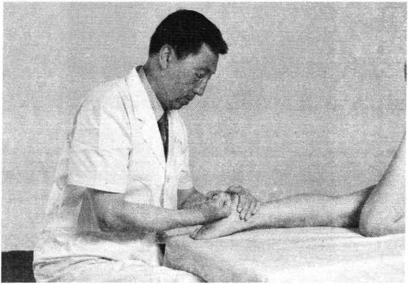 散点推拿法操作技巧:体位同上,术者一手扶托足背部,用另一 手食、中、环、小指指端弥漫散点足底至局部有微热感, 再改用手掌从前足底推向足跟,最后向上拿起。此手法系 整理动作,用力要求适中,反复操作6~8次(照片345)。