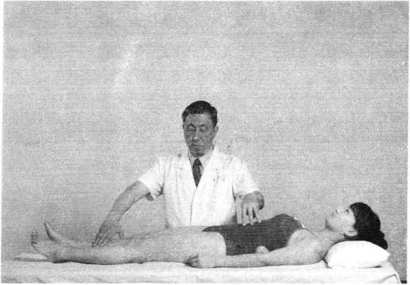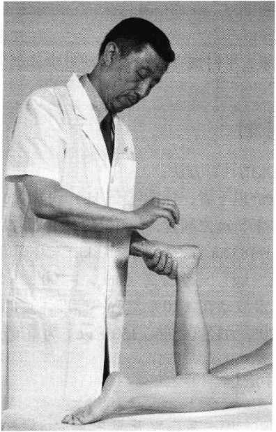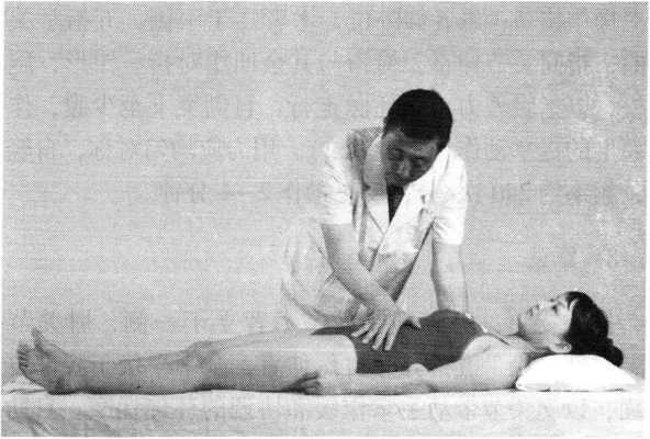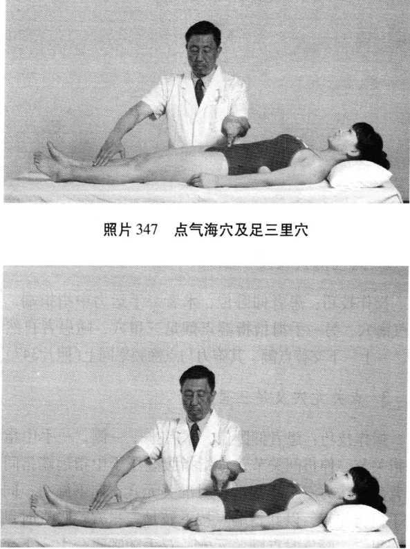 点气海穴及足三里穴操作技巧:患者仰卧位,术者一手运力中指指端,点 颤气海穴,另一手拇指指端点颤足三里穴,随患者自然呼 吸,一上一下交替点颤。其施力与点颤频率同上(照片347)。
