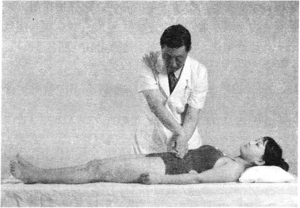 .滚推捋拿法操作技巧:患者仰卧位,术者左上肢屈肘,前臂极度 外旋置于患者双肋下缘;右上肢屈肘,前臂中立位,其近 端尺侧置于左前臂中段处,边用右前臂从肘至腕方向压 滚,边使左前臂滚推。当右前臂压滚至腕部时,改内旋 位,右手掌紧贴患者上腹部,五指伸直,分指,中指置于 前正中线处,左手加压于右手背侧,以自上而下为序,点 按任脉诸穴到下腹部,再五指并拢向上拿起(照片354)。 如此反复操作4〜6次。注意用力适中,速度稍慢,以患者 无不适感为宜。