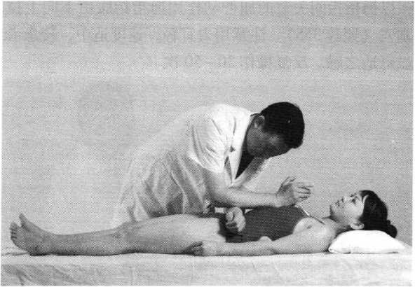 操作技巧:患者仰卧位,术者坐于一侧,一手屈掌指 关节,伸指间关节,中指指间关节微屈,并与相邻两指分 开,以食、中、环指指端分别着力于上、中、下三院穴的 同一水平线上;同时另一手拇指外展屈掌指关节,伸指间 关节,以其指端部点按一侧足三里穴,患者吸气时用力向 下点颤足三里穴,呼气时另手点上、中、下三院穴,如此 双手随呼吸交替用力。施治时,运力于指端穴位处,应缓 缓下压点颤并渗透人里(照片346)。一侧完毕后,更换另 侧。左右侧各点颤4〜6次,其频率以240次/分为宜。