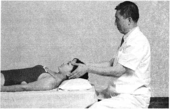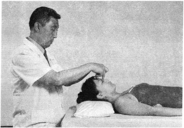 操作技巧:患者仰卧位,术者坐于头侧,双上肢屈 肘,腕关节平伸,食、中、环、小指并拢置于患者两侧颍 部,以拇指指间关节的屈伸动作用拇指指腹由下向上捋理 印堂穴(照片355)。注意用力宜轻,速度适中,使患者有 明显舒适之感。反复操作30 ~50次。