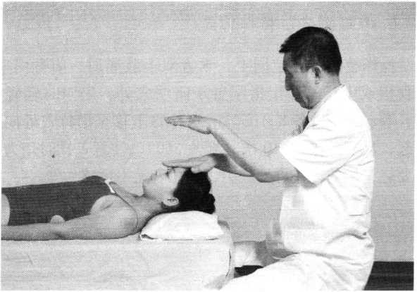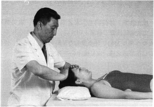 .开天门操作技巧:体位同上,术者双上肢屈肘,腕关节平 伸,以大鱼际肌置于前额正中线处,同时向两侧分推至太 阳穴处(照片356)。注意推的力量稍重,速度适中,使患 者有清醒舒适之感。反复操作6〜8次。