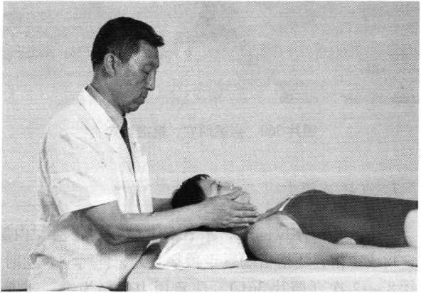 拉天门操作技巧:体位同上,术者双上肢屈肘,前臂内旋, 腕关节平伸,食、中、环、小指并拢伸直,掌侧面着力, 从掌根到末节指腹从下向上交错拉捋天门(照片358)。注 意用力均匀,速度适中,以患者有舒适感为佳。反复操作 10〜20次。