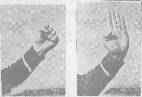 (二 掌四指并拢伸直,拇指的第一节向内扣屈 (图二)