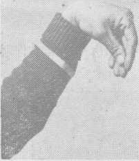 (一)、握拳四指向内卷紧,拇指的第一节压在食指 与中指的第二节上,手腕挺直(图一)。握拳时,拳心不要 留空,手腕必须挺直,以免在击中目标时,手指和手腕受 伤。