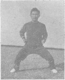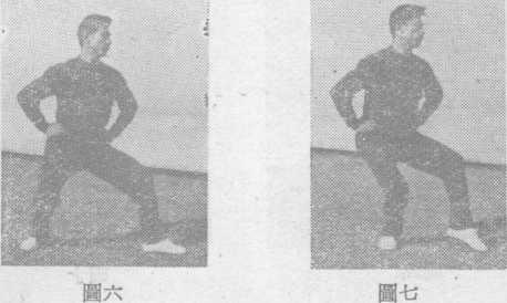 (六) 、半马势分左右两势(动作与骑马势略同)。 左半马势,左腿移向左侧半步,脚尖向左边微内扣,右膝向 前微内扣,两脚全掌着地,两腿稍弯屈;上体正直稍向左 转,重心稍偏于右腿(图六)。右半马势,动作相反。