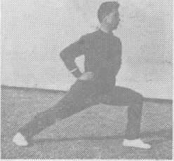 (七) 、虚步(又 丁虚步)分左右两势(动作和半 马势略同)。左虚步,右腿弯屈支持体重,左脚尖在前点 地,左腿虚放在前面,两脚距离约半步;身体稍向左转,上 体微前倾,收腹(图七)。右虚步动作相反。