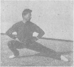 (八) 、仆腿分左右仆腿。左仆腿,右腿尽量弯屈, 膝盖向右斜前方,右脚用力内扣,左腿向左侧尽量伸直,脚 尖向前,体重大部分放在右腿上,两脚全掌着地;腰部挺 直, 上体稍前倾并向左转(图八)。右仆腿时,动作相反。