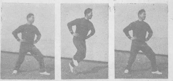 (十一)、跳步分向前、后和向左、右侧跳四种。 如由左半马势向前做跳步时,先将体重移至左腿,右腿抬 起,借左脚向后蹬伸的力量,使右腿向前跳进,左腿随着跳 起,右、左脚先后悬空落地,仍成左半马势;悬空时,全身 放松(图十一之①、⑤、③)。向后跳步时,动作相反。 如由骑马势向左侧跳步时,先将体重移至左腿,右腿抬