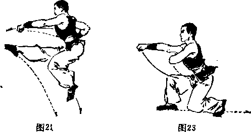 身体重心移至右脚,左脚向前向上摆起,然后迅速屈膝 上提。右脚蹬地跳起,身体腾空,右腿屈膝,以脚背为力点 伸膝向前弹踢,脚面绷直;同时,右掌向外缠腕刁抓成拳, 小臂外旋,屈肘收于腰间,拳心向上。左掌变拳收回腰间, 然后再以拳面为力点,直臂向前冲出,拳心向下,眼看前 方。如图22所示。