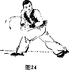 身体起立,重心移至左脚,右脚屈膝提起,向左脚后挑 一步,右脚掌落地,成插步;同时,上体微左转,右臂外 旋,右拳以拳轮为力点,向左下方横击,臂微屈,拳心向 上,高与腰平。左掌向体侧自然摆动,然后掌心向上,托扶 在右腕部,眼看左下方。如图24所示。