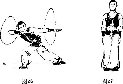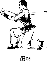 以拳背为力点,收至腹前,向上弧行再向前下反劈,高与肩 平,臂微屈,拳心斜向后。眼看右拳前方。如图25所示。 二十六、插步横摆掌,