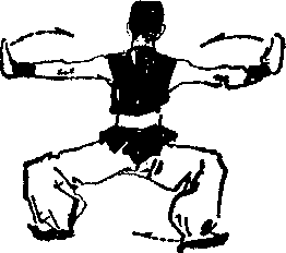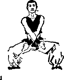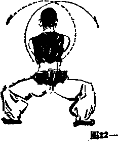1.左脚向右脚左侧上一步,成左右平行站立,右拳变 掌,两手在胸前交叉,手心向内,右手在上,左手在下,眼向前看,如图22 —1所7 。2 .上体醢屈膝下蹲,成马步,同时两拳以拳根为<力点,向上抡劈于两侧,两1 臂伸平,掌指向上,手心向 外,眼向前看。如图22—所示。