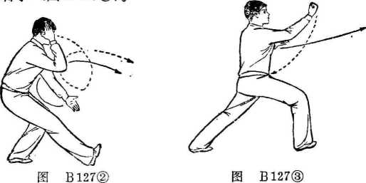 身体重心前移,右腿屈膝下蹲,左腿挺直成右弓步。同 时,左掌由下向左、向上屈肘下按,掌心朝下;右掌变拳小臂 内旋向下、向上屈肘划弧并向前翻出,拳心朝上,高与眼平。 目视右桊(图B 127②)?