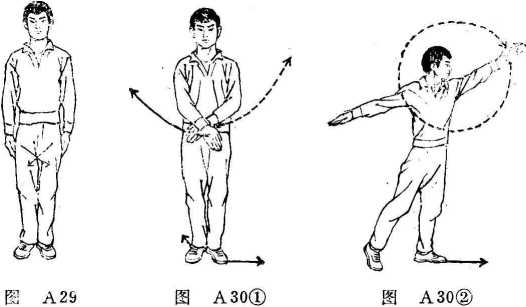 上动不停。上体微向左转。同时,左掌直臂向下经左体 侧向后弧形至体后,掌心朝右;右小臂外,由后向上向前弧形 直臂绕至头前,掌心朝上。上体前倾。目视左掌(图A30④)。