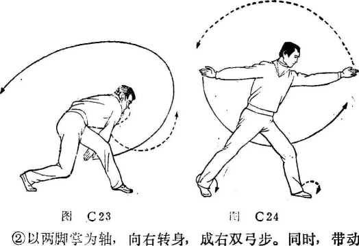 ①上体抬起,并向右转,带动右手直臂前挑,并向上向右 抡转,至体右侧,虎口朝上;左手协同向下向前划弧挑起,至 左平.目视斜上方(图C 24)。