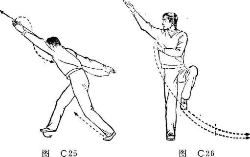 手直臂向上向右抡转,至头前上方,虎口朝上;右手直臂向下 经身后向左抡转,至身左后方,虎口朝下。目视右手方向(图 C25)。