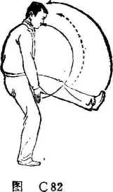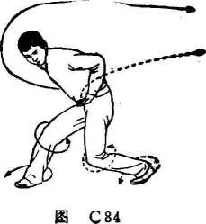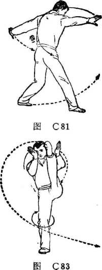 上动不停,右脚向右前方上步,脚尖外展,两手向两侧 (偏后)分开。目视右方(图C81)。其后动作与“右抹面脚”动 作相同,唯左右相反(图C 82、83、8心。(注:图片上的肢体 位置的不同处,是拍摄时间差所致,其左右抹面脚的动作完全 如一)。