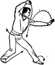 4动不停,扣左脚,上体向下并右转,带动右臂稍 抬肘 (肘领先) 下,每档前向右(手背朝前) 摆至胸平,向下合