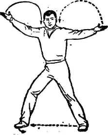 图 C159m c 6?右脚向右落步,成开立步;右腿稍屈,身体转正。同时, 两手向两侧托起与肩平,臂稍屈,手心朝上(图C 160)。