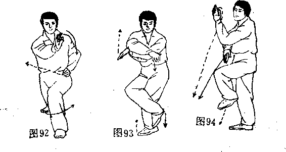 (1) 右脚提起,向左前盖步,右脚悬于左膝外侧。同 肘,.两手胸前绕臂交叉,左手在右腋下,成俯拿。右手在右 臂外侧成俯掌(如图9)。:,接上势不停,右脚落震地后,左脚随即提起,成 独立步同时,左掌由下向上翻,折臂屈肘,成左俯掌。目 视左前方。(如图94)。接上势,右腿下蹲,左颺仆步。.两手向下作拾捧 动作,目下视两手(如图95)。接上势,上体起立,两脚成撗褛步。同时,右手 握拳,经右侧:拳至额前翻拳,拳心向前。左手握立拳,带 至左腹前,“如拳捧打虎势〃,目视左方(如图96)。