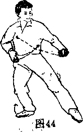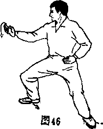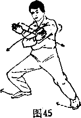 )右脚向右后,横退半 步,左脚尖内扣,上体随右转90° 成马步。同时,左手向胸前右拦。 右手由腹部,经左肘外向上,贴于 左臂外侧。两臂在胸前交叉(如图 45) 下肢不动,右掌外旋向 右前方劈成侧掌。左侧掌收回左腰 侧,掌心向内,拇指弯曲。目视右 手(如图46)。2