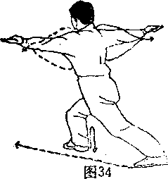 右脚向左后方退一步,左脚向 右后方退一步,身体左转180°,成 右弓步。双手由胸前向两侧分开, 成双分掌势,掌心向上,与肩同 高,力达小臂,目视前方(如图34〉。