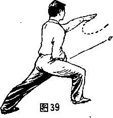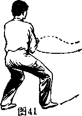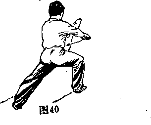 (1)左脚退半步,右脚随之 擦地收回半步,变右虚步;同时, 两掌收于上腹前面,两腕交叉, 左手在上,掌心向上(如图41)。(2)右脚快速向右侧移半 步,变右弓步,同时,两掌仍交 叉,左掌在上,向右拳上切击,力 达掌外缘,.掌心向下(如图42)
