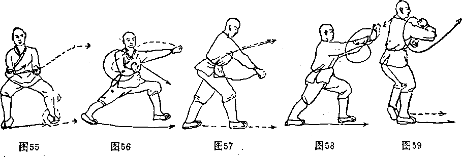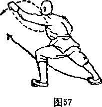 頂心標拳兩脚碾地,體左轉90度,成左弓步;同時,右拳向外再往内劃 狐,然後拳抱腰間,左拳向前擊出,拳心向下,目視左拳(圖56)。