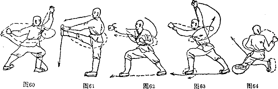 并步抱肘抬右脚移於左脚後外侧一步,身體向左轉體180度,收右脚成 并步,右拳隨身屈肘上衝,拳心向後,高與肩平,同時左拳變掌,向外療摟,然後屈 肘右推,附於右肘内侧,兩腿微蹲,目祝右侧(圖60)。