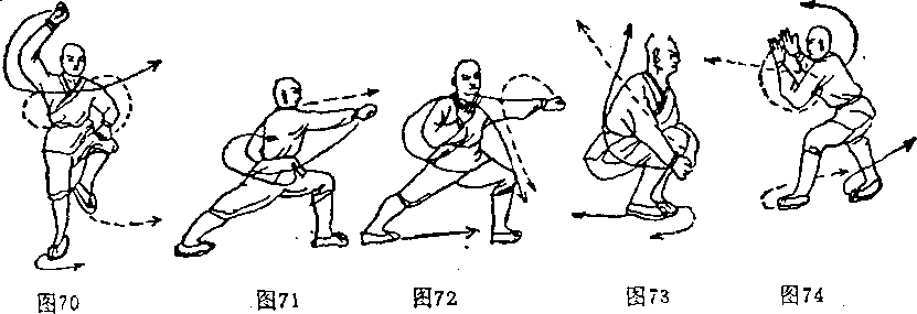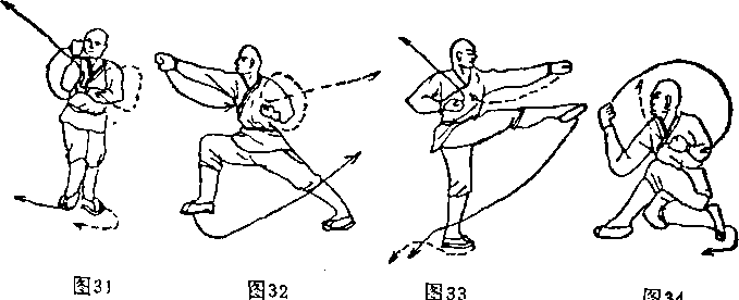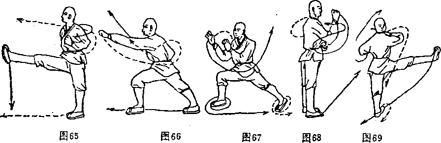 右脚向上擺踢,高度不可高於肚臍部,左脚的擺動和落脚要穩,要同全身動 作協調一致。