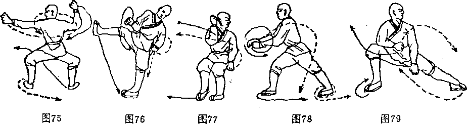鐵牛拉犁收左脚落於右脚後,向左轉體90度,抬右脚向前彈蹬,左拳回 胸前屈肘抱於腰間,右拳向右侧屈肘抖拳,目視左侧(圖76)。