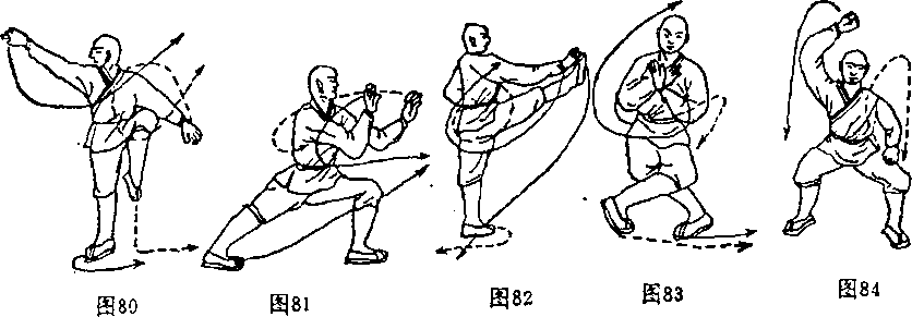 鴻雁展翅起身,右腿直立,左腿提膝,向右轉體90度,兩拳變掌,由胸前 向兩侧展出,右臂稍高於左臂,目祝右手(圖80)。
