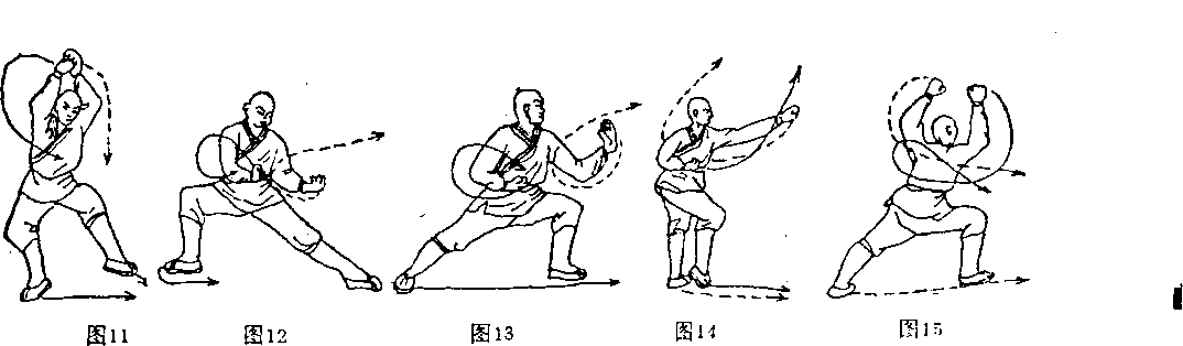 老虎出洞兩脚碾地,體稍向左轉,兩脚向前縱跳一大步,右脚落左脚 前,成右弓步,同時,兩拳由胸前向前上方環頭衡出,兩拳眼相對,目視右拳 (齒 15)。