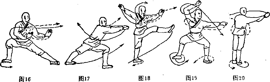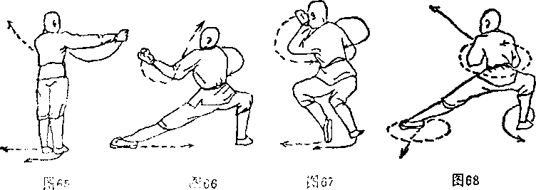 形成樸步後,兩脚尖内扣,兩拳的動作要與全身的動作相協調,挺胸塌腰。