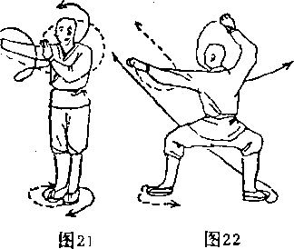 并步側衝拳右脚後退一步,兩脚碾地,體右轉180度,抬左脚向前與右 脚上成并步,雙手左胸前環弧,右拳由胸前向右側衡擊,奉心向前,左掌由左向右 屈肘推出,掌心向右,目視右拳(圖21)。