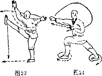 撩掌彈腿兩脚碾地,向左轉體90度,抬右脚向前方彈踢,兩拳變掌,左 掌向前上方撩打,右手由胸前向後方甩捺,目視右脚(圖23)。
