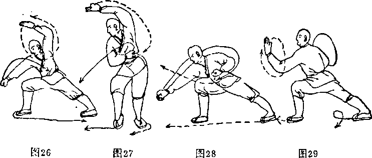 攔,然後抱於腹中部,左掌在變步時,向下再反上劃弧,然後舉臂環架頭上,掌指 向右,掌心向上,上體向右侧詈屈,兩腿微蹲,目視右侧(圖27)。